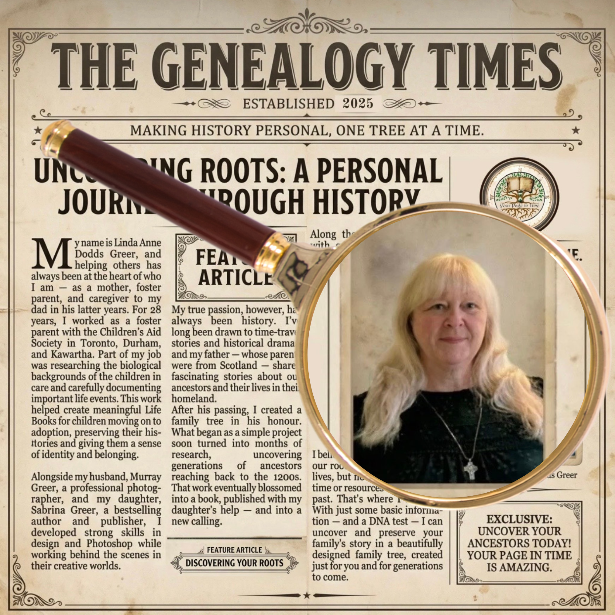 Along the way, I connected with genealogists and other historians and became immersed in research communities such as Ancestry, FamilySearch, Newspapers.com, Fold3, and Find A Grave, to name just a few. I began creating family trees for relatives and friends, and before long, Your Page in Time was born.